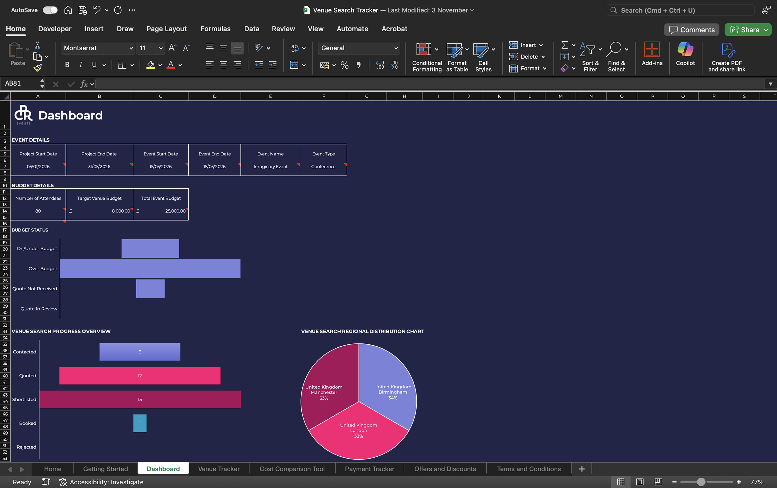 Whether you’re planning product launches, corporate conferences, awards ceremonies, or client entertainment, finding and securing the perfect venue requires systematic organisation, detailed comparison, and careful budget management. Our Venue Search Tracker Template eliminates the chaos whilst ensuring you make informed decisions based on comprehensive data analysis.