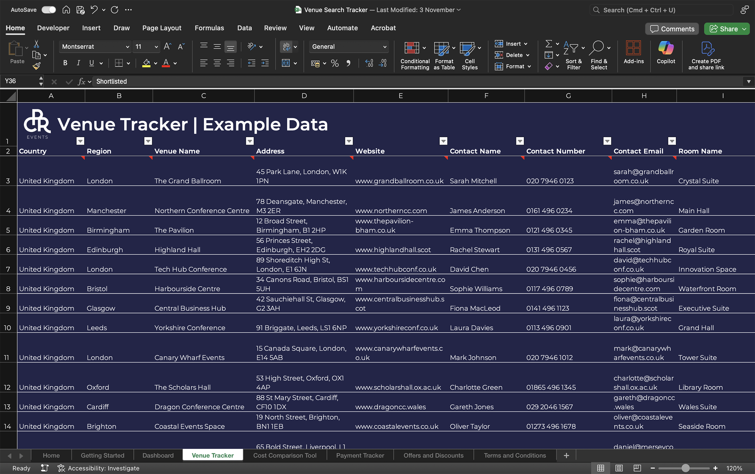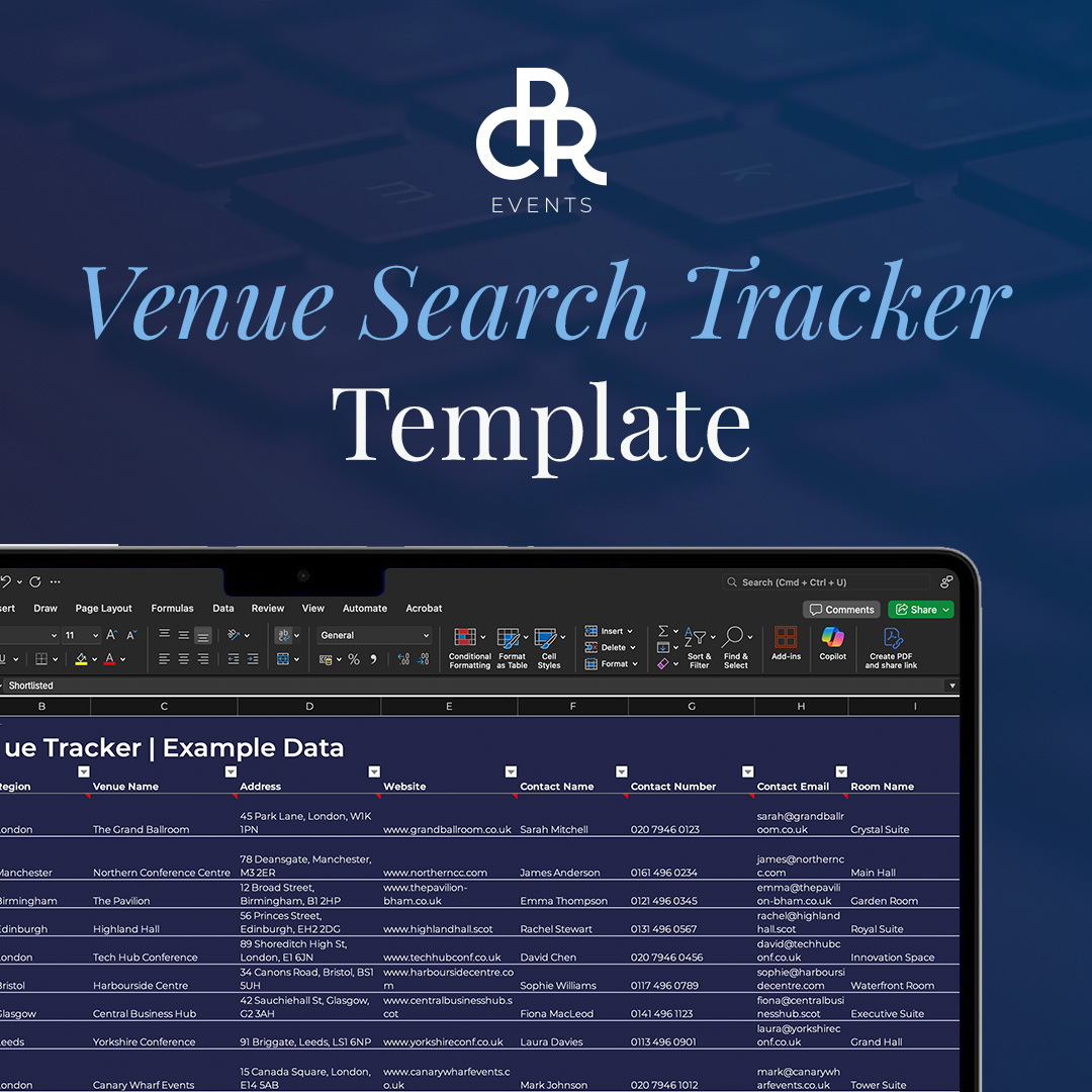 Transform your venue selection process with our comprehensive Venue Search Tracker Template, the ultimate solution for professional event planners who understand that choosing the right venue is critical to event success. Developed from 18+ years of managing corporate events across the UK and internationally, this isn’t just a comparison spreadsheet – it’s a sophisticated venue management system designed specifically for the complexities of corporate venue sourcing.